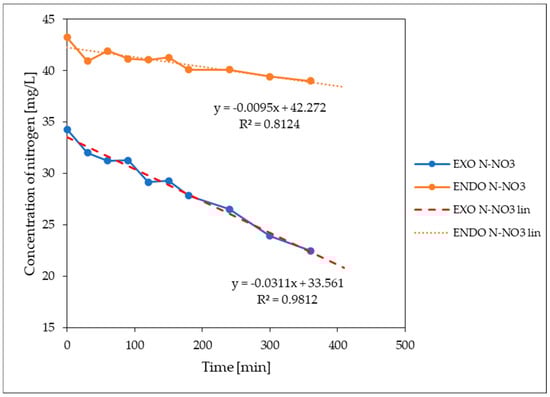 To determine the nitrification and denitrification activity, sludge samples were taken from the activation tank, for laboratory kinetic tests. The specific nitrification rate in the tested sludge and also the specific rate of endogenous and exogenous denitrification were determined according to the procedure outlined in the Material and Methods section. Sampling was carried out every 30 min for 6 h, and the progression of N-NH4 and N-NO3 concentrations was monitored. The results of the nitrification tests are shown in Figure 8.