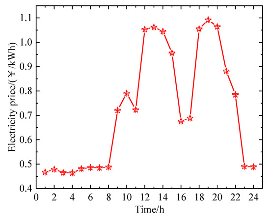 Figure 3 shows the real-time electricity price data for the regional power grid. The real-time electricity price exhibits a stepped characteristic, with prices significantly higher during peak load periods than during off-peak periods. This helps to guide users to purchase electricity during off-peak hours, thereby alleviating system balancing pressure. The critical charging price is set to be 10% lower than the average price of the day, while the critical discharging price is set to be 10% higher than the average price of the day. The grid repurchase price for electricity is set to the average price of the day. During peak load hours, there is a sharp increase in electricity demand, which may exceed the capacity of the power supply to meet all users’ needs. At such times, to maintain the stability and safe operation of the power system, electric utilities must implement a series of measures to ensure adequate power supply, including increasing power generation and adjusting grid operation modes. These measures, in turn, elevate the cost of the power supply, resulting in a corresponding increase in electricity prices. From the perspective of the electricity market, electricity prices are a direct reflection of supply and demand dynamics. When demand exceeds supply, prices rise to discourage some non-essential usage, thereby restoring market balance. This market mechanism encourages users to rationalize their electricity consumption schedules and reduce peak-hour demand [20].