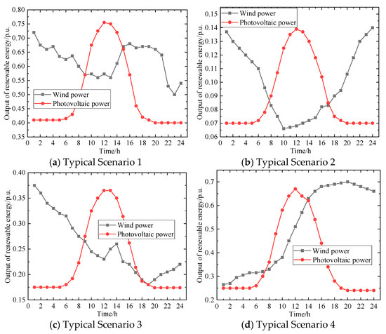 In this paper, the initial wind–photovoltaic scenarios are divided into four typical output scenarios. The wind power data used in this paper are historical records from the region. This is primarily because power systems have accumulated a vast amount of historical wind power data over long-term operations, which encapsulate seasonal and diurnal variations in wind power output [15]. These data are invaluable for analyzing the uncertainty of wind power. While real-time data can reflect the current actual wind power output, data from a single time point may fail to comprehensively represent the long-term trends and uncertainties of wind power output [17]. Furthermore, real-time data can be subject to instantaneous influences from various factors, such as sudden changes in meteorological conditions or equipment failures, which may cause significant fluctuations in the data, adversely affecting the stability and accuracy of dispatch decisions. Moreover, power system dispatch not only concerns the balance of power supply and demand in the current period but also necessitates consideration of power production plans for the coming period. Historical data provide a more comprehensive picture of wind power output, facilitating the development of more scientific and rational long-term dispatch plans. Through the analysis of historical data, the impact of wind power output uncertainty on power system operation can be assessed, enabling the formulation of corresponding risk mitigation measures. This risk assessment method based on historical data is more robust and reliable [20]. Based on this classification, the scenario partitioning is performed to obtain the typical scenario curves and their corresponding probability distributions. The occurrence probabilities of Typical Scenarios 1–4, are 0.383, 0.209, 0.195, and 0.213, respectively. The four typical renewable energy output scenarios are shown in Figure 4 below.