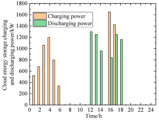 To demonstrate the effectiveness of the scheduling model more intuitively, a typical scenario is selected and the detailed wind power and photovoltaic data are shown in Figure 5 below. Figure 6 below illustrates the charging and discharging power of a typical daily user for a cloud-based energy storage device. It can be observed that users tend to charge their devices during periods of low electricity prices and low load demand, while discharging them during times of high electricity prices and peak load demand. This strategy not only minimizes their electricity costs but also helps to flatten the load curve by reducing peak loads and filling in valleys, thereby optimizing overall energy usage.