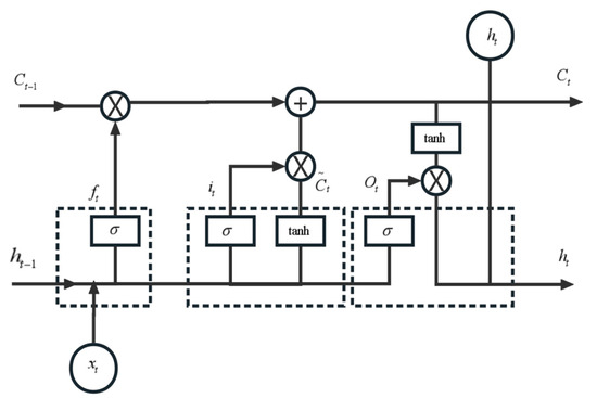 LSTM introduces the concepts of gates and memory cells in each hidden layer. The forgetting gate deletes old input data and resets the memory unit; the input gate adds fresh valid information to the memory unit; and the output gate activates the valid information for filtering and output to the succeeding network. This approach of managing the memory units by three gating units overcomes the problem that RNNs cannot acquire long-distance temporal relationships and successfully mitigates the gradient vanishing problem [15,16,17]. This makes LSTM an appropriate neural network topology for tackling the long-term dependence problem. The state update equations for the basic units of LSTM are shown in Equations (1)–(6):