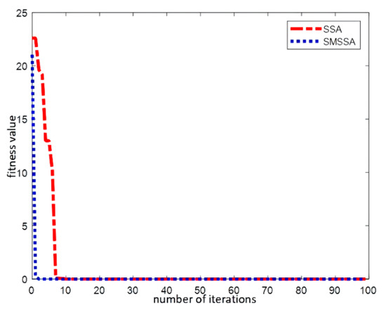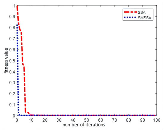 Table 2 shows that the average SSA value in the sphere test function is 1.18 × 10−25 while the average value of SMSSA is 6.23 × 10−34, and compared to SSA, the accuracy of SMSSA is nine orders of magnitude greater. In the Griewank function, the average value of SSA is 3.76 × 10−12, while the average value of SMSSA is 7.22 × 10−15, and at this time, SMSSA is three orders of magnitude more accurate than SSA; in the test of the Ristrigin function, SMSSA accuracy is two orders of magnitude better than SSA. From the above, it can be learned that SMSSA is better than SSA in searching ability. It shows that SMSSA is able to find function values that are closer to the optimal value during the optimization search, indicating that it has better optimization results
