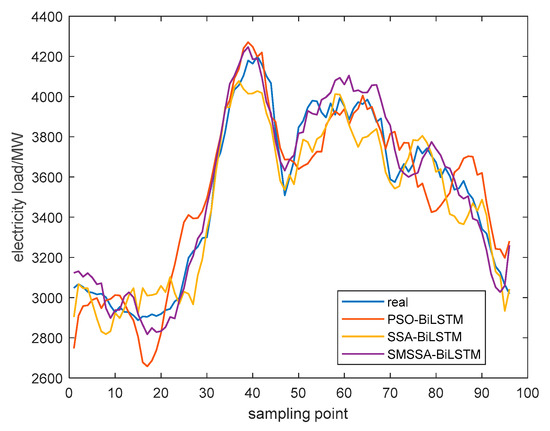 In this part, a multiple-input, multiple-output model is used to forecast the 96-load data of the following day using the 96-load data of the previous day and the highest and lowest temperature of the following day. The present study employs a BiLSTM model with two hidden layers. The number of nodes in hidden layer 1 is set to 200, and the number of nodes in hidden layer 2 is set to 20. The learning rate is set at 0.005. The model has 98 input nodes and 96 output nodes. The number of nodes of both hidden layers is set to [1, 300] for the search of optimization, the range of training times is set to [10, 300], the number of sparrow population is set to 5, the maximum number of iterations is set to 10, and the search of optimization for the learning rate is set to [0.01, 0.001]. In the SSA and SMSSA optimization algorithms, the warning value is set to 0.6, the proportion of discoverers is set to 0.7, the proportion of aware of dangerous sparrows is set to 0.2, and the worst number of sparrows for the simplex search in SMSSA is set to 5. The inertia weight in PSO is set to 0.8, and the learning factors are all set to 1.5. The following are the simulation results of each combined model.