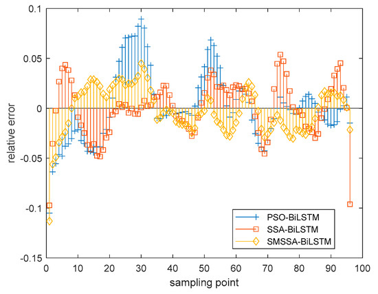 The overlap between the real and projected values of many models, including SMSSA-BiLSTM, SSA-BiLSTM, and PSO-BiLSTM, is rated from high to low in Figure 7 and Figure 8. Due to the sparrow search algorithm’s advantage for the optimization time, the SSA-BiLSTM and SMSSA-BiLSTM load profiles fluctuate more than the PSO-BiLSTM load profiles and are smaller and more stable. In SMSSA-BiLSTM, the best-fitting results are obtained due to the stronger optimization seeking ability of the improved sparrow optimization algorithm. Further, their relative error curves are plotted as shown in Figure 9.