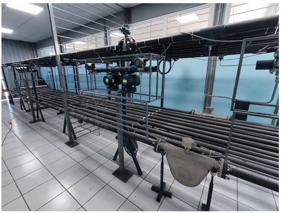 The roughness coefficient of the pipeline was obtained in a previous investigation directly focused on calibrating the hydraulic model []. The pressure wave velocity was calculated according to the system’s characteristics, such as Young’s modulus of elasticity of the conduit walls, the density of the fluid, and the bulk modulus of elasticity []. The calculation of this parameter has been explicitly described in []. Note that these calculations were performed considering environmental temperature at approximately 30 C and the procedure described in []. The parameters must be recalibrated for different conditions.