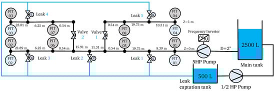 The pilot plant considered in this paper is located at the Technological Institute of Tuxtla Gutierrez, Mexico and is displayed in Figure 1. The Pipeline and Instrumentation Diagram (P&ID) is displayed in Figure 2. It is a re-configurable plant that is controlled by two spherical valves located in the branches (see Figure 2), which can be configured as a single pipeline or a branched network. The WDS is fed with a reservoir with a capacity of 2500 L using an Evans 6IME0500 5hp centrifugal pump whose operating point can be varied using a frequency inverter, which allows the simulation of different flow input conditions. The system is instrumented with eight industrial Yokogawa EJA530E transmitters located in the nodes (PIT-1 to PIT-8), two Yokowaga ADMAG AXF magnetic flow meters located at the ends of the branches (FIT-3 and FIT-4), and two Yokogawa Rotomass Coriolis flow meters located at the input and the output of the main pipeline (FIT-1 and FIT-2). The acquisition of data is performed by a modular block (Yokogawa GM10) with five electronic valves (TONHE A20-T15-P2-B) to simulate leaks in different locations.