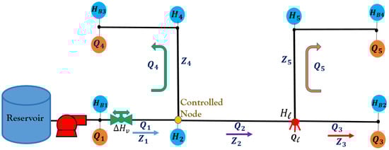 Figure 3 displays the schematic diagram of the hydraulic network with two branches, considering the variables that will be used to describe the dynamical model, the directions of the flows, the pressures in the nodes, and the control element: here, ’s [m] denotes the lengths of each section of the network, ’s [m3/s] the flows through those sections, ’s [m] the pressures at the nodes, ’s [m] the pressures at the boundary nodes, the pressure at the leak, and the leak flow (typically, for some leak coefficient [m5/2s−1]). In addition, a pressure-reducing valve (PRV) is used as an actuator (generating ), and the main idea is to use a dynamical model for the whole system to design a controller acting on , such that the leakage flow that occurs through the hydraulic network can be reduced.