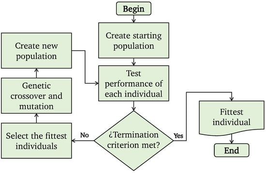 As discussed above, the diagnosis element is performed using a GA, which is a meta-heuristic method inspired by the evolution of the species in which an iterative search of the fittest individual of a population is performed, thus providing an optimal solution to a provided problem. In the context of a GA, it is proposed that a population of candidate solutions for a given problem are found within a search area. The performance of each candidate solution is tested and those that provide the best performance are selected to create a new population similar to the best-performing individuals in the previous population. Using this iterative test and selection, the new population is iteratively enhanced until the fittest solution is found [,]. This process of performance testing and the creation of a new population takes place iteratively as the population gradually gets better at solving the problem until some termination criteria are met. A termination criterion can either be (1) a maximum number of generations (iterations) has already passed, or (2) an adequate solution was found such that the error is lower than a pre-set error value. This entire process is presented schematically in Figure 4.