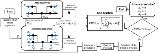 For illustrative purposes, let us consider in Figure 5 a hypothetical scenario where a leak takes place at the second position (Leak 2 in Figure 2). The GA calibrates additional demand values in some nodes suspected of presenting the leak, minimizing the error between the measured and simulated values. The estimated demand for the node in which the leak actually occurs will evolve to values significantly higher than zero. In comparison, the estimated values for the rest of the nodes will tend to significantly lower values. The node in which the highest demand value is calibrated will be considered as the one with the leak. If no leak is detected, then, all values are calibrated to close-to-null values. An adequate threshold value must be manually implemented in such a way that those values that are calibrated above this threshold indicate the occurrence of a leak. It should be noted that even if the diagram represents a scenario where the leak takes place at the second position, the methodology can be generalized for leaks at other positions.