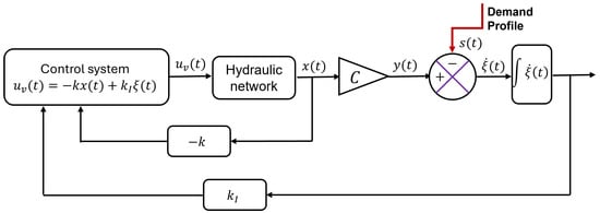 Leak diagnosis using the GA locates the node where the leak occurs. A LQR controller is then designed to reduce the magnitude of water losses using a PRV located at the input node. LQR is a controller that calculates the optimal state feedback gain matrix K, with the aim of minimizing the performance index and obtaining the optimal input to the system. Figure 6 displays the control system in a block diagram: the output signal , system state , and the feedback control with gains K, obtained from LQR design, are shown. It is important to mention that the error is integrated so that the output converges to the desired set point s (assumed to be provided by a manager according to the leak detection, as in []).