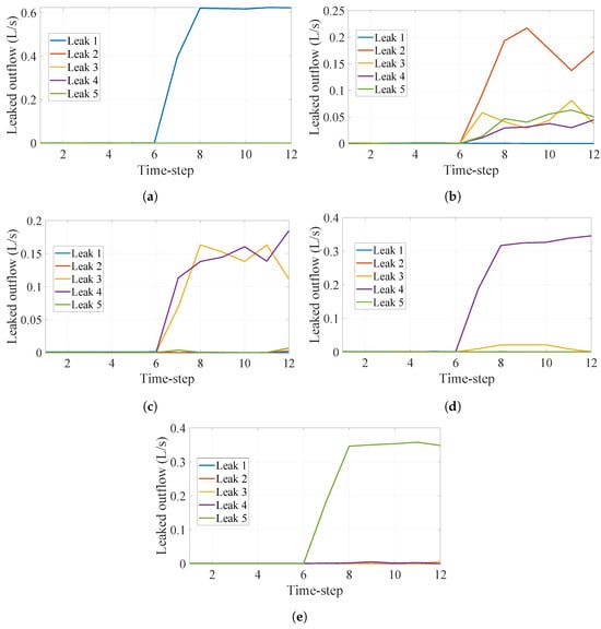 Estimation of the leaked outflow for all the possible leak positions. (a) Estimation of the leaked outflow when a leak occurs at position 1. (b) Estimation of the leaked outflow when a leak occurs at position 2. (c) Estimation of the leaked outflow when a leak occurs at position 3. (d) Estimation of the leaked outflow when a leak occurs at position 4. (e) Estimation of the leaked outflow when a leak occurs at position 5.