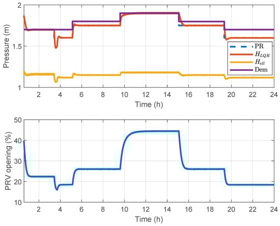 The leak diagnosis in the hydraulic network using the GA-based methodology allows us to obtain the location of the affected node. Then, the controller is activated to reduce the effect of the leak, that is, to ensure that an adjusted set-point is tracked []. Figure 8 shows a 24-h simulation, where the leak is detected at approximately 04:00 a.m.; the purple line at the top shows the leak-free demand, the blue dotted line corresponds to the pressure reduction (PR), that is, the new set-point when the leak was detected, the red line corresponds to the controlled pressure at the critical node successfully following the set reference, and finally, the yellow line represents the effect of pressure at the node where the leak occurs. The graph below shows the opening and closing of the pressure-reducing valve, where the adjustment of the set-point for the reduction in the pressure given the occurrence of the leak can be seen, and the valve closes 6% to generate the reduction effect of pressure throughout the system. Then, the PRV reopens to meet the reference set-point value. It can be emphasized that control actions in the network generate a decrease in the magnitude of the leak. It should be noted that even if this percentage was obtained using a small-sized experimental WDS in a laboratory context, the system here used as a case study was designed to replicate, as accurately as possible, the behavior of a large-scale urban WDS. Further testing of the proposed methodology in a more complex system and considering uncertainties in measured data or the system model needs to be conducted to obtain accurate performance metrics in a real-world implementation.