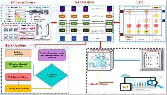 This research proposes an improved version of the PSO approach to improve the optimization potential and rate of convergence. In addition, nonlinear variable inertial weights are included in the PSO method. The proposed approach was motivated by investigations carried out by Hu et al. [], Zhi et al. [], and Ma et al. []. Researchers have demonstrated a significant improvement in the precision of SOH estimation. The Bi-LSTM model efficiently captures the temporal dependencies and fluctuations in the LIBs dataset. The model can be improved by capturing such patterns and merging them with PSO, leading to estimates of SOH that are highly precise. Moreover, the SOH of the LIBs features is estimated well by combining PSO and Bi-LSTM. The PSO algorithm can contribute to reducing overfitting in the Bi-LSTM approach by identifying the most suitable combination of hyperparameters to achieve a balance between computational complexity and accurate estimation. For instance, this article distinguishes itself from others in terms of its approach to addressing the issue, organization of the neural network, parameters used in PSO and Bi-LSTM, and performance metrics used to assess the outcomes. The authors first divided the collected LIBs dataset into training, cross-validation, and testing sets. Subsequently, the authors proceeded to develop a Bi-LSTM neural network. After that, the IPSO approach is used to adjust the hyperparameters of the Bi-LSTM and, at last, the estimation of SOH. This article demonstrates the approach used for SOH estimation, as shown in Figure 1.
