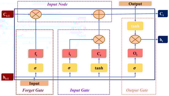 The following are the mathematical formulas that characterize the LSTM network: The input at time step t should be represented by Xt, the hidden state by ℎt at time step t, the cell state by ct at time step t, and the sigmoid and hyperbolic tangent functions by σ and f, respectively. The LSTM formulas are expressed as follows []: