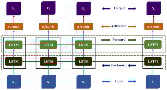 BiLSTM consists of two hidden layers, the forward and backward LSTM layers, which are connected to the same output layer. The forward LSTM layer output were evaluated by BiLSTM independently after that every time step t is likewise concatenated through BiLSTM. The following Equations (10)–(12) expresses the BiLSTM process [].