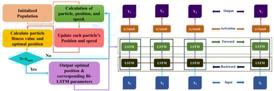 The IPSO-Bi-LSTM model demonstrated a mean decrease of 0.2188% in MAE, 0.2003% in MSE, and 0.1192% in RMSE when compared to the Bi-LSTM model. The IPSO-Bi-LSTM model demonstrated an average reduction of 1.6023% in MAE, 4.5708% in MSE, and 1.7204% in RMSE when compared to the LSTM model. The average computational time taken by the LSTM, BiLSTM, LSTM-Bi-LSTM, and IPSO-Bi-LSTM models was 64, 41, 25, and 13 s, respectively. The IPSO-Bi-LSTM model demonstrated a decrease in computational time in comparison to the three models, with average reductions of 52, 29, and 13 s, respectively. The Bi-LSTM model increases the algorithm’s accuracy while incorporating IPSO strengthens the model’s estimating capabilities. This advantage improves the feasibility of implementing the proposed method in real-world scenarios [,].