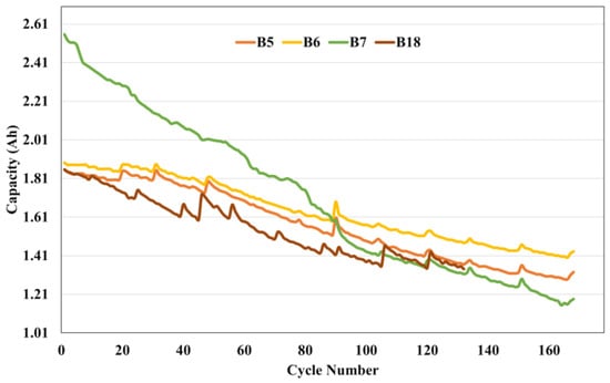 This research utilizes the NASA batteries public dataset from the NASA Ames Centre of Excellence for Estimation database []. The batteries are listed as B5, B6, B7, and B18. Choose a dataset that has four 2 Ah rated 18,650 LIBs in it. The batteries in this group are subjected to identical external conditions and measurement procedures. During the battery cycle aging test, the battery is maintained at an ambient temperature of 24 °C. The charging procedure starts with a period of constant current (CC) charging, followed by constant voltage (CV) charging. The charging procedure is as follows: first, charge with a constant current (CC) of 1.5 A until the voltage reaches the cut-off voltage of 4.2 V; thereafter, charge with a constant voltage (CV) of 4.2 V until the current decreases to the cut-off current of 20 mA. CC mode discharges the battery at 2 A until it reaches the cut-off voltage. Temperature, voltage, and current are among the variables that are monitored and saved throughout every charge/discharge operation.