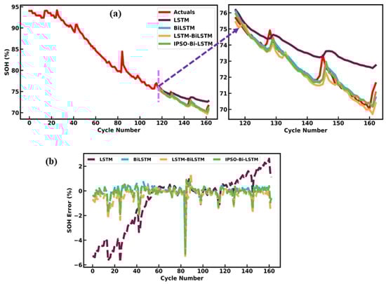 To evaluate the effectiveness of the IPSO-Bi-LSTM model in estimating the SOH of LIBs, the authors used error assessment measures, including the Mean Absolute Error (MAE), Root Mean Square Error (RMSE), and Mean Square Error (MSE). The LSTM, Bi-LSTM, and LSTM-Bi-LSTM are popular neural network models that will be included for comparison to validate the efficiency and superiority of the developed IPSO-Bi-LSTM model for the estimation of SOH of LIBs. The data for each battery include the voltage, current, and capacity. The model was trained on 70% of the data and tested on 30% of the data for SOH estimation. Figure 7 shows the estimated outcomes for battery B5. However, the estimated SOH of the LIBs at the 117th cycle was taken as an initial point. The LSTM model estimates a specific real value while estimating SOH; however, the highest estimation error and computation time were 8.79% and 77 s (sec), which cannot properly pre-estimate the LIBs SOH operation to the final stage, as shown in Figure 7a,b. The Bi-LSTM model has a maximum estimation error and computational time of 4.59% and 50 s. The Bi-LSTM model exhibits a reduction in the highest estimate error and computational time of 4.20% and 27 s. Nevertheless, when the number of cycles increases, the estimates of the Bi-LSTM model diverge from the actual value and exhibit a visible delay, which is unsuitable. The LSTM-Bi-LSTM model has a maximum estimate error and computational time of 4.37% and 39 s. The LSTM-Bi-LSTM model achieved a 0.22% reduction in the maximum estimation error and a computational time of 11 s compared to the Bi-LSTM model. This improvement leads to a considerable enhancement in the estimation performance. However, the model’s estimation accuracy remains insufficient. The IPSO-Bi-LSTM model has a maximum estimation error of 4.10%, and with a computational time of 17 s, the estimation curve steadily fits the actual value. After comparing to the other three models, there was a reduction in estimation error of 4.85%, while in computational time, there was a 22 s improvement in estimation precision, making it excellent.