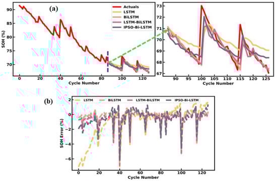 The estimation approach for the SOH of the B7 battery starts with the process of estimating the SOH of the LIBs at the 117th cycle, as illustrated in Figure 9. At the 117th cycle, the LSTM and Bi-LSTM models precisely estimated the initial fluctuation, with maximum estimation errors of 5.82% and 5.07%, respectively. However, the computational times are 71 s and 53 s. The Bi-LSTM maximum estimate error reduction of 0.75% is smaller than that of LSTM and is computationally efficient for 18 s. The maximum estimation error of the LSTM-Bi-LSTM model is 5%, and the computational time was 21 s; the error is reduced by 0.07% when compared to the Bi-LSTM model. However, it was computationally efficient for 32 s. The estimation error of the IPSO-Bi-LSTM model is reasonably stable and approaches the actual value, and the maximum estimated error that was observed is 4.91% with a computational time of 11 s. It obtained a reduction in error and computational efficiency compared to the previous model of 0.9% and 10 s. The IPSO-Bi-LSTM model estimates the LIB SOH more precisely and efficiently than the LSTM, Bi-LSTM, and LSTM-Bi-LSTM models when employed on the B7 battery.