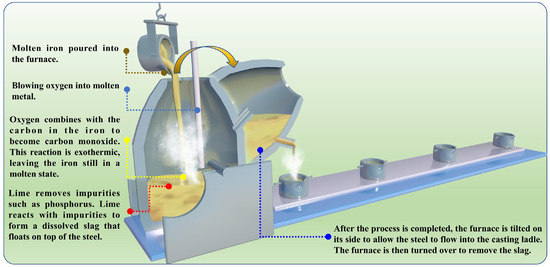 In summary, the BOF steelmaking process mainly includes the following [44]: (1) Pretreatment of hot metal: In the steelmaking process, pretreatment of hot metal refers to a series of preliminary processing techniques applied to molten iron. These techniques involve the removal of impurities, such as sulfur and phosphorus, and the adjustment of the chemical composition of the hot metal to enhance the quality of the final steel product [45]. (2) Converter charging: Adding scrap, molten pig iron, and additives into the converter. (3) Blowing: Injecting oxygen to react with impurities at high temperatures, removing them through oxidation and reduction, and adding alloying elements. (4) Tempering and alloying: Adjusting steel composition and properties by adding alloying elements in the ladle during tapping. (5) Output of steel: Pouring out the steel when carbon content, temperature, and other elements meet the required standards. The process of manufacturing BOF steel is shown in Figure 1.
