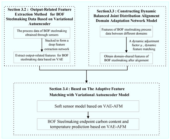 In Section 3.2 and Section 3.3, we introduced the use of the variational autoencoder model for extracting features from BOF steelmaking data, and the dynamic balanced joint distribution alignment domain adaptation network model for reducing differences between various BOF datasets. Based on the previous analysis, this section constructs an adaptive feature matching variational autoencoder model (VAE-AFM). As shown in Figure 4, the model is generally divided into four stages: domain partitioning, feature extraction, domain adaptation, and endpoint carbon content and temperature prediction. This model is designed to process data from the BOF steelmaking production process, particularly addressing the issue of concept drift.