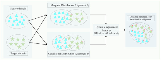Among them, . When = 1, the above formula becomes a marginal distribution; when = 0, the above formula becomes a conditional distribution; and when = 0.5, the above formula becomes a joint distribution. Furthermore, based on the previous analysis, this paper employs MMD distance to construct a dynamic balanced joint distribution alignment network.