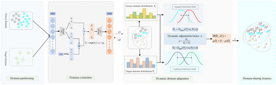 The model achieves efficient domain adaptation by adaptively aligning the distributions across different domains. During the domain adaptation process, the contributions of marginal and conditional distributions to domain divergence are not identical. To accurately assess and adjust the influence of these distributions, the model first utilizes maximum mean discrepancy to separately calculate the marginal distribution difference and the conditional distribution difference between the source and target domains. This step ensures that the model can quantitatively capture the degree of divergence between different distributions. Subsequently, the model introduces a dynamic adjustment factor , which is designed to evaluate the relative importance of marginal and conditional distributions in real-time during the domain adaptation process. This dynamic adjustment factor adaptively adjusts the weights of each distribution based on the observed differences between them, allowing the model to flexibly address distributional discrepancies across different domains. Through this mechanism, the model not only achieves simultaneous alignment of marginal and conditional distributions but also dynamically adjusts the importance weights of these distributions in response to variations in inter-domain differences. This dynamic weight adjustment mechanism enhances the model’s adaptability and robustness when handling data from different domains, ensuring stability and predictive performance under varying distribution conditions. Overall, the model not only effectively reduces inter-domain distribution discrepancies during the domain adaptation process but also significantly improves its generalization capability in cross-domain applications.
