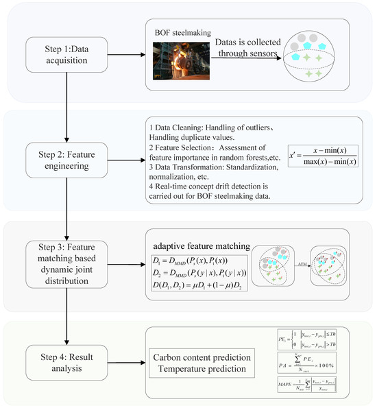 Therefore, to address the issues of high dimensionality, strong nonlinearity, and concept drift in BOF steelmaking process data, an endpoint carbon content and temperature soft sensor model for BOF steelmaking is proposed in this study based on adaptive feature matching variational autoencoder (VAE-AFM). The variational autoencoder (VAE) model combines deep learning and variational Bayesian probabilistic inference to extract nonlinear feature representations of data. In this paper, VAE is utilized to extract features of BOF steelmaking process data. To effectively address the concept drift problem in BOF steelmaking, this paper proposes an adaptive feature matching (AFM) method. This method adaptively adjusts the weights of the marginal and conditional distributions between the extracted BOF steelmaking data features, thereby minimizing distribution differences between different BOF steelmaking datasets.