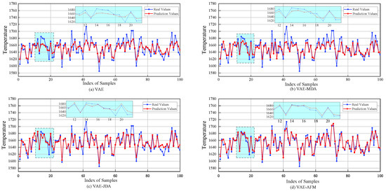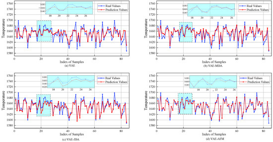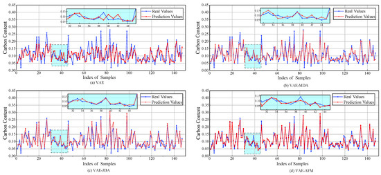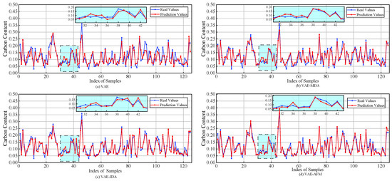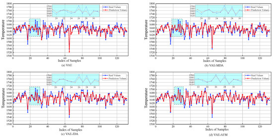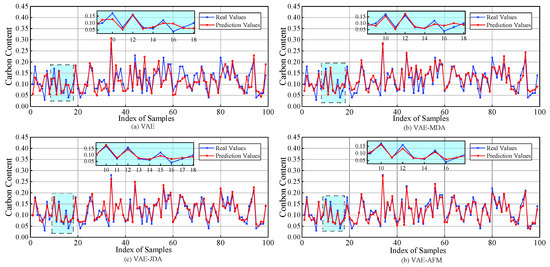 Analyzing the aforementioned experimental results, it becomes apparent that the proposed VAE-AFM model exhibits the highest accuracy among the various soft sensor models, significantly outperforming the other models. The VAE-AFM model achieved outstanding performance on the BOF steelmaking dataset. This can be attributed to the VAE model’s ability to extract complex features from the BOF steelmaking data and the dynamic balanced joint distribution alignment domain adaptation model’s adaptive adjustment of the relative importance of marginal and conditional distributions between different domains, effectively reducing inter-domain differences.