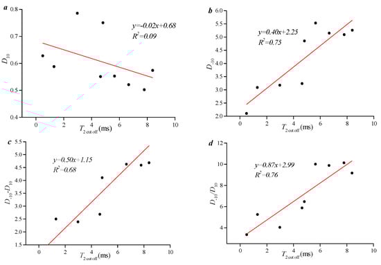 Correlation analysis of multiple fractal dimensions with T2 cut-offs: (a) Correlation analysis of D10 with T2 cut-offs; (b) Correlation analysis of D−10 with T2 cut-offs; (c) Correlation analysis of D−10–D10 with T2 cut-offs; (d) Correlation analysis of D−10/D10 with T2 cut-offs; (e) Correlation analysis of D−10–D0 with T2 cut-offs; (f) Correlation analysis of D0–D10 with T2 cut-offs.