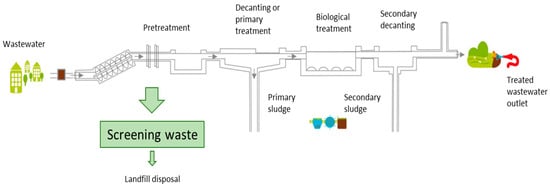 - De la Torre-Bayo, J.J.; Martín-Pascual, J.; Torres-Rojo, J.C.; Zamorano, M. Characterization of Screenings from Urban Wastewater Treatment Plants: Alternative Approaches to Landfill Disposal. J. Clean. Prod. 2022, 380, 134884. [Google Scholar] [CrossRef]