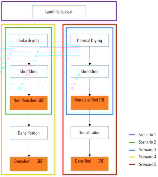 The study establishes a systematic framework for evaluating five distinct waste management scenarios, providing a thorough comparative analysis of landfill disposal against innovative processes for producing solid recovered fuel (SRF). The defined scenarios have been established based on the SRF production process, and these are identical to those proposed in a previous article on the economic study [44] (Figure 2):