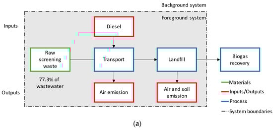 The inventory modelling stage plays a pivotal role in LCA analyses by establishing a connection between all unit processes within the study up to the final product [41]. This phase strives to procure all the required quantities to develop the product/waste flows and elementary flows, which are subsequently categorised into inputs and outputs within the chosen system boundaries [42]. The inputs comprise the materials, energy and resources that enter the unit process, while the outputs comprise the products, waste and emissions generated due to the process [43]. Specifically, a gate-to-grave analysis was conducted here, starting from the raw screening up to the various final waste scenarios. The transformation of raw material into the fractions present in the waste (Table 1) involves several degradation processes that are difficult to quantify, which is why it has not been included in the system boundaries. Biogas recovery or the thermochemical process after SRF production were not considered part of the present research.