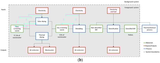 (a) Flowchart of landfill disposal of raw screening waste. Scenario S1. (b) Flowchart of solid recovered fuel (SRF) production from raw screening waste. Scenarios S2, S3, S4 and S5.