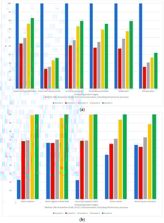 (a,b) Comparison of impact assessment of the various scenarios according to the CML-IA baseline v3.08 methodology.