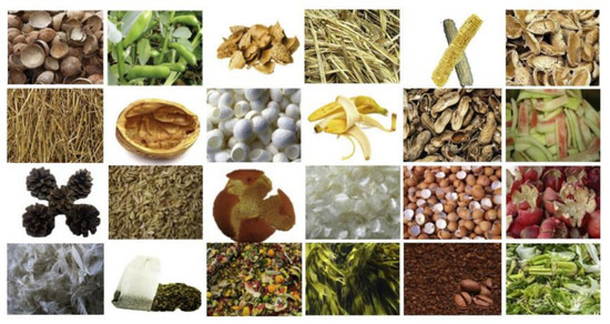 Biomass is a naturally occurring non-fossil fuel organic material that contains intrinsic chemical energy. It includes resources from agriculture, forests, and urban waste products [44], such as wood, sawdust, straw, manure, wastewater, and household waste [45,46]. Some of these are represented in Figure 2. Compared to fossil fuels, waste material releases fewer greenhouse gases, and the burning of fossil fuels leads to climate change and global warming, increasing the contents of so-called greenhouse gases (CO2, CH4, and NOx) in the atmosphere. Biomass is plant material derived from a reaction between carbon dioxide (CO2) and air, water, and sunlight via photosynthesis. It is efficient to process biomass either biologically or chemically by extracting the energy stored in the chemical bonds. The carbon is then oxidised to produce carbon dioxide and water. Since the process is cyclic, CO2 is available to produce new biomass [47]. Some of the main reasons for the investigation of biomass are to somewhat mitigate the issues of climate change and global warming and to reduce the use of fossil fuels and our dependence on them. Biomass energy is one of the most abundant renewable energy sources, representing 10.4% of the total energy supply of the world and 77.4% of the renewable energy supply [46].