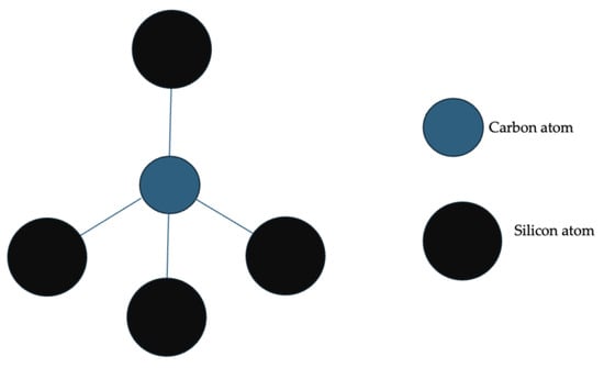 In Figure 4, silicon is covalently bonded with layers that alternate between silicon (Si) and carbon (C). In the tetrahedral structure in Figure 4, the carbon atom is connected to three silicon atoms inside the bilayer and has a single bond connected to a silicon atom. The length of the bond is 1.89 Årom the closest neighbouring Si atom to the carbon atom; 3.08 Å is the distance between two atoms of the same species in the SiC structure. Silicon carbide has numerous amounts of polytypes, but the most common ones are polytype 3H, which is cubic; hexagonal 4H; 6H polytypes; and rhombohedral 15R [89,98,99].