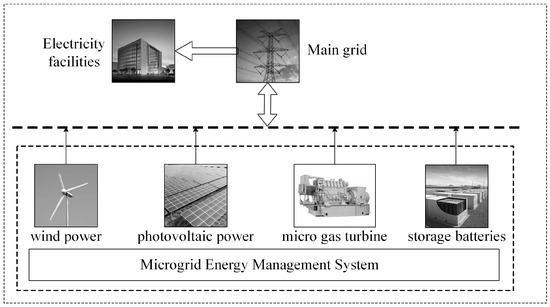 Microgrids usually contain clean energy generation systems, conventional energy generation systems, energy storage systems, and power consumption facilities [18]. Therefore, microgrid subsystems are modeled as photovoltaic power generation, wind power generation, micro gas turbine power generation, and battery charging and discharge models. Since different energy devices have different output characteristics, microgrids must be able to efficiently utilize renewable energy resources while meeting the power demand for reasons of economic efficiency. Therefore, effective energy management systems are needed to optimize their combined use. The system architecture is shown in Figure 1.