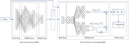Utilizing the actor–critic framework, which amalgamates the Dueling DQN and DDPG algorithms, the Dueling DQN is deployed within the actor network, whereas the DDPG is incorporated into the critic network. The DDPG is responsible for serializing the discrete actions and generating continuous action values corresponding to each discrete action. Following this, the Dueling DQN processes the current observation state along with the continuous action values as input to emit the maximized Q-value associated with the discrete action that optimizes the Q-value. Through this mechanism, the optimal discrete actions and their corresponding continuous action values are determined. The architecture of the network is illustrated in Figure 2.