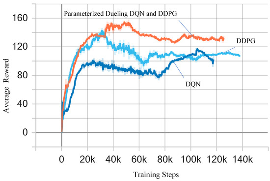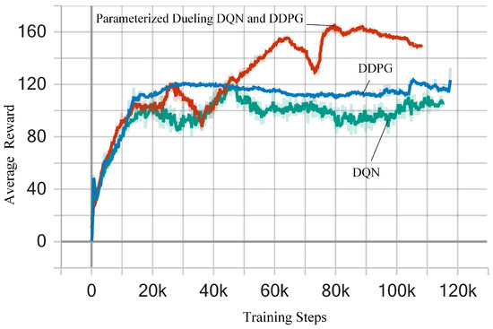 As observed in Figure 5, the algorithm continues to exhibit the best performance even at a learning rate of . In the initial stages of training (0–20 k steps), the curve rises rapidly, achieving an average reward close to 140. Subsequently, the curve peaks between 20 k and 40 k steps (near 160), but as the number of training steps increases, the reward slightly decreases and stabilizes, eventually remaining between 120 and 140. This indicates that the algorithm can still learn effectively at a higher learning rate, albeit with potentially greater fluctuations. Overall, the parameterized Dueling DQN and DDPG combination algorithm demonstrates strong learning capabilities and relatively stable performance across different learning rates, while the performance of the standalone DDPG and DQN algorithms tends to degrade when using higher learning rates. This suggests that the parametric mixed action-space combination algorithm is more effective in complex environments.