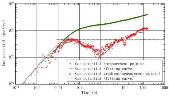 Darcy flow tends to overestimate the energy supply of the reservoir, leading to a uniform pressure decline across the entire field as production progresses. This results in an initially high pressure near the wellbore during the early stages of development (Figure 5a), which results in no significant retrograde condensation phenomena (Figure 6a), contradicting the actual production dynamics, as shown by the blue line in Figure 13. In contrast, the nonlinear model reveals that pressure depletion is confined to the near-well region, offering a more realistic depiction of reservoir pressure maintenance (Figure 5b). This study successfully enhances the accuracy of historical matching, as demonstrated by the red line in Figure 13. Moreover, most current studies derive the parameters of nonlinear equations through physical simulation experiments, which not only lack a solid theoretical foundation but also involve high experimental costs. Consequently, this paper introduces a method for nonlinear parameter inversion by utilizing nonlinear numerical simulation results and the well testing theory, thereby addressing the scientific challenges in nonlinear parameter selection.