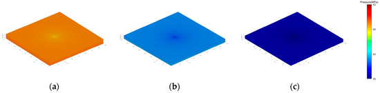 Pressure field comparison for different nonlinear seepage parameters (t = 10 years). (a) a = 0.25, (b) a = 0.5, and (c) a = 0.75.
