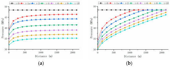 Figure 3 and Figure 4 illustrate the variations in the pressure distribution under the Darcy flow and nonlinear flow modes, respectively. In the case of Darcy flow (Figure 3), the pressure field shows that, due to the absence of additional flow resistance typically present in low-permeability reservoirs, there is no significant pressure drop region around the production well. As production continues, the pressure across the entire reservoir tends to level out and maintain a uniform distribution. In contrast, the pressure propagation range under nonlinear flow exhibits a distinct boundary (Figure 4). This phenomenon occurs because the presence of nonlinear flow introduces increasing flow resistance to fluid migration under smaller displacement pressure gradients. Consequently, the pressure propagation rate significantly diminishes at the boundary while the near-wellbore region remains unaffected. This results in a substantial pressure drop around the production well, whereas the pressure in the far-field region remains close to the original reservoir conditions and is not utilized.