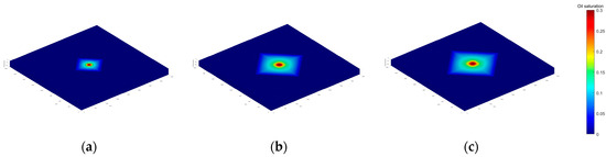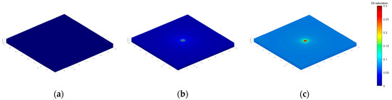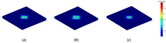 Darcy flow condensate oil saturation changes. (a) t = 5a, (b) t = 20a, and (c) t = 30a.