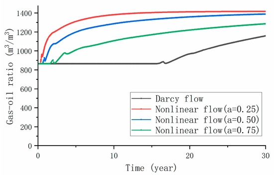 Figure 10 compares the gas–oil ratio variation trends for Darcy flow and three different nonlinear flow scenarios. From the production dynamics perspective, the GOR for Darcy flow remains stable and does not increase over the first 15 years, which significantly deviates from the actual production behavior of the condensate gas reservoir shown in Figure 1. The insufficient energy supply of nonlinear flow, which results in a significant pressure drop near the wellbore, leads to a rapid increase in the gas–oil ratio within a short period. As production continues, the rate of increase in the GOR gradually slows down. Additionally, because smaller nonlinear parameters result in greater flow resistance, the retrograde condensation phenomenon near the wellbore becomes more pronounced, shortening the stabilization period of the GOR and accelerating its increase.