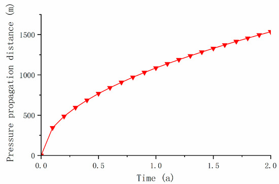 The pressure propagation distance at different production times was calculated using the actual parameters of the B6 gas reservoir. As shown in Figure 11, the pressure propagation speed is relatively fast during the initial development phase and then gradually slows down. After one year of production, the pressure boundary reaches 1085 m and extends to 1535 m after two years. In Section 2, a numerical simulation study of nonlinear flow and pressure propagation range prediction was conducted. By setting different nonlinear parameters for the condensate gas reservoir, the numerical simulation results were fitted to the DOI predicted values until a successful alignment was achieved. Through this method, the nonlinear flow parameter for the low-permeability condensate gas reservoir in the B6 buried hill was determined to be a = 0.75.