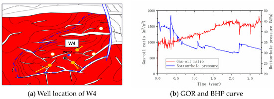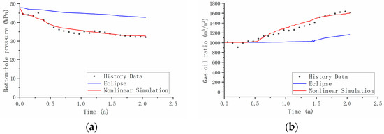 Historical fitting curves for Well W4. (a) Well bottom–hole pressure fitting and (b) gas–oil ratio fitting.