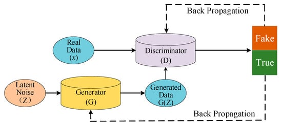 GAN was proposed by Ian Goodfellow [25], which consists of two sub-networks as illustrated in Figure 1, a generator and a discriminator. This algorithm has demonstrated strong capabilities in learning data representations through mutual competition. The training strategy is defined by a maximum–minimum game, simultaneously training both components. The generator (G) extracts samples from a simple noise distribution, such as Gaussian or uniform distribution, maps them to the data space similar to the input real data, and aims to generate data that appear as realistic as possible through training. On the other hand, the discriminator (D) is trained to maximize the probability of correctly identifying the source of input data. As a result of this adversarial training process, the distribution of generated fake data tends to approximate that of real data.