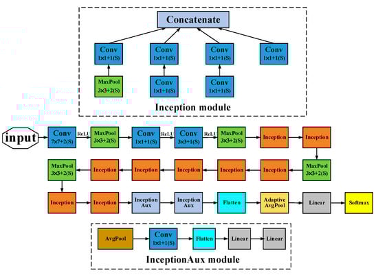 GoogLeNet [28] is a deep convolutional neural network developed by the Google research team in 2014. It won first place in the ImageNet competition. The network structure is shown in Figure 2. The network structure made some improvements on the basis of LeNet [29] and AlexNet [30], and introduced new design ideas and techniques so that the network could better deal with complex image classification tasks. Compared with traditional convolutional neural networks, GoogLeNet uses a parallel architecture called the “Inception” module, which is able to simultaneously extract features at different scales and merge them together. This design enhances the network’s ability to capture details and global information without increasing its depth or number of parameters.