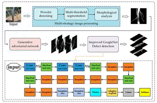 In practice, there are relatively few defects in transmission lines, resulting in an imbalance between normal samples and fault samples, which adversely affects the accuracy of line state recognition. Therefore, this paper proposes a novel method for defect diagnosis of transmission lines. Firstly, considering potential illumination and background interferences in captured images, multi-strategy image processing including wavelet denoising-based image enhancement, HSV color space-based multi-threshold segmentation, and morphological analysis is proposed to extract the transmission line area. Subsequently, GAN is employed to generate images of transmission lines to enhance the sample morphological diversity and reduce the effect of data imbalance. Finally, the deep network GoogLeNet is improved by superseding the original cross-entropy loss function with focal loss function to achieve deep feature extraction of images and defect diagnosis of transmission lines. The specific implementation steps are outlined below, and the flowchart is depicted in Figure 3.